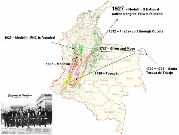 初めてコーヒーの木が植えられたのは1730年から1732年の間で、タバケのサンタテレサでのことです。その後、1736年にポパヤン、1787年にはGironとMuzo、そして1807年にはメデリンへと伝わります。 1832年には初の輸出がククタからなされました。そして1927年、メデリンでFNC(コロンビア国立コーヒー生産者連合)が設立されたのです。左上の写真はFNC創設会議での1ショットです。
