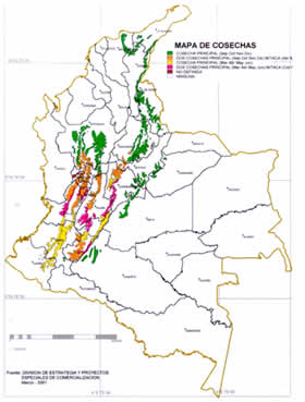コロンビアは南米の北西に位置しており、大西洋・太平洋といった2つの大きな海に接しています。コーヒーの生産はアンデス山脈から続いてくる山脈にそった地域で行なわれています。