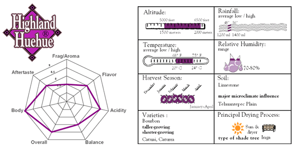 非火山地帯のコーヒー産地3つの中で最も乾燥して標高が高いウエウエテナンゴ。辺鄙な場所で起伏が激しい場所。メキシコのTehuantepec平原から吹く乾いた暖かい風が山岳地帯に吹きこみ、霧から守られている。海抜2000mの高地でも栽培が可能なのはこのため。 |